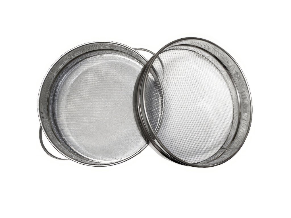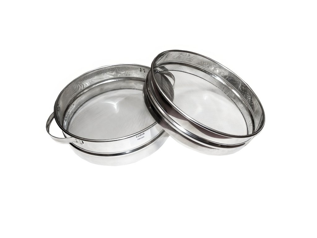 Cedníky na med, dvojitý, nerez, s uchy. Cedník je určen na cezení medu. Je dvojitý, plochý a nerez. Nerez tkanivo je pevně spojené s obrubou z nerez plechu a držátkem s háčkem z nerezového drátu. Cedníky mají jednak hustší tkanivo s oky 1x1 mm, jednak řidší tkanivo s oky 2x2 mm. Cedník je používán k cezení čerstvě vytočeného medu, který je potřeba vycedit od zbytků víček a úlomků plástů. Nerez je znám díky své čistotě a potravinářské nezávadnosti. Používá se i díky odolnosti proti korozi. Nerez odolává atmosférickým vlivům, působení vody a organických kyselin. Nerez je využíván hojně v potravinářském průmyslu.