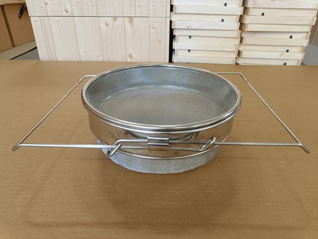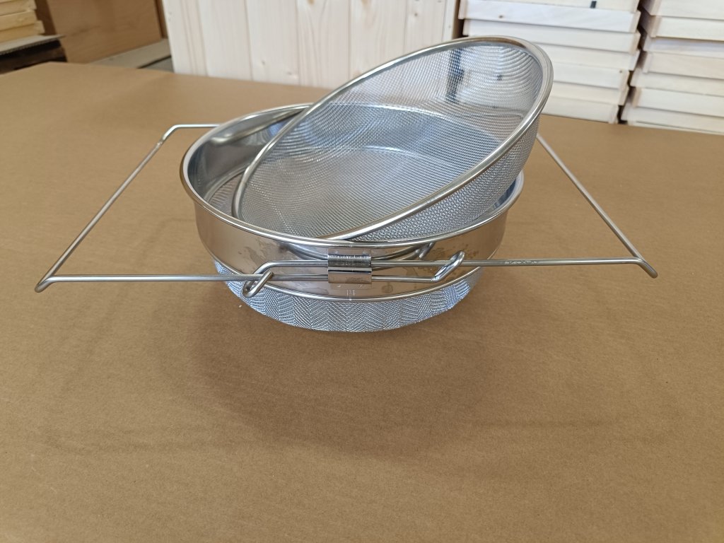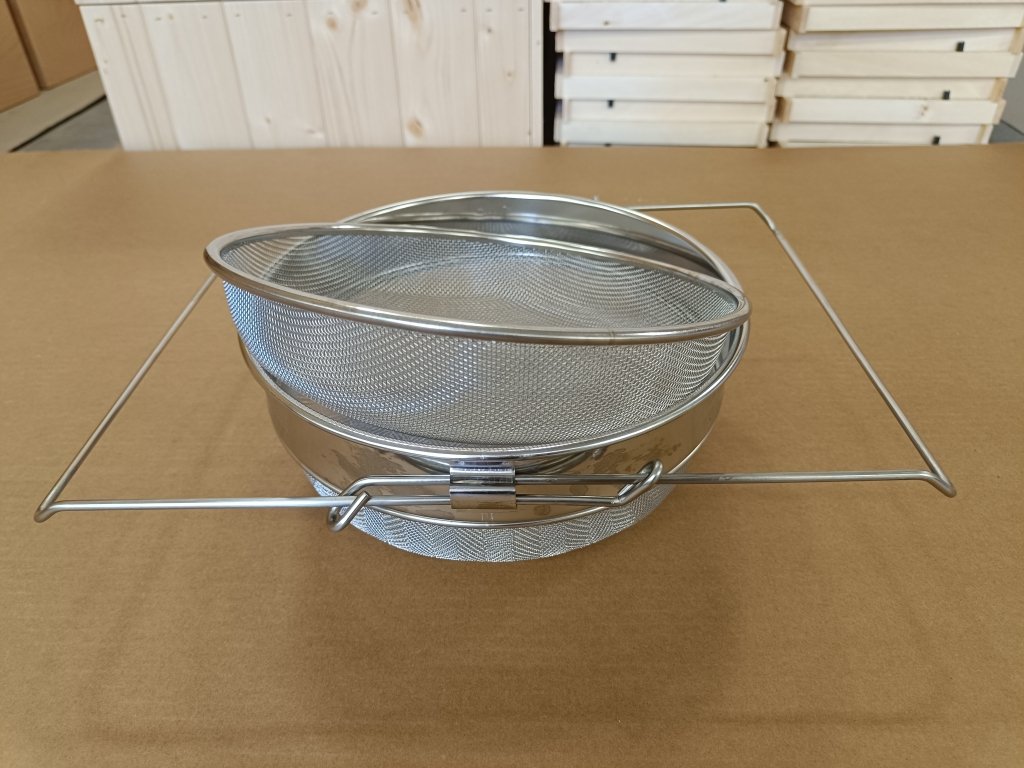 Velký nerezový cedník z kvalitní nerezové slitiny s dvojitou síťkou pro dokonalé vycezení medu. Průměr cedníku je 24 cm, pro nasazení na libovolnou nádobu slouží posuvným držákem. Hustší z dvojice sít má oka o rozměrech 1x1 mm a je vypouklý, hrubší síto má oka o rozměrech 2x2 mm a je také vypouklý. Obvykle se používá k cezení medu, který vypouštíte z medometu do skladovacích nádob. Pro kontakt s medem důrazně doporučujeme právě nerezové pomůcky, které jsou mnohem kvalitnější a nepodléhají degradačním procesům jako pocínované pomůcky.